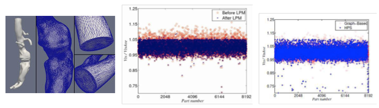 Figure: Vertex imbalance before and after applying LIIPBMod and HPS to a 16.7M element anisotropically adapted mesh used in the simulation of an abdominal aorta aneurism (left image). The two graphs (center for LIIPBmod and right graph for HPS) indicate the average number of vertices per part divided by the average per part before (red dots) and after (blue dots) application of the algorithms. Note in both cases the spikes (red dots in the upper parts of the graphs) that reduce scalability are dramatically lowered after the algorithms have been applied.