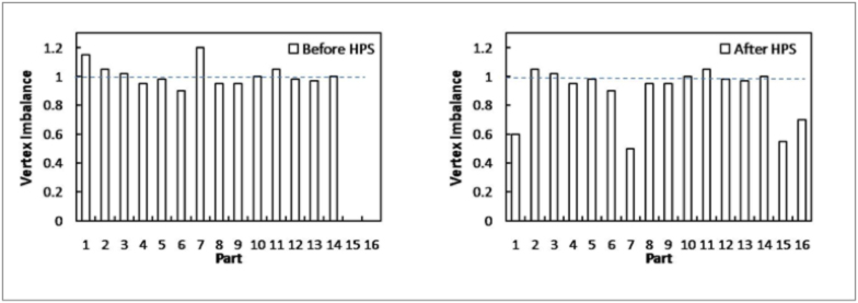 Figure: Vertex imbalance before and after HPS for a 16 part example. The partitions on parts 1 and 7 are split and given to parts 15 and 16 to improve overall performance.