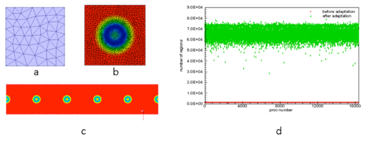 The mesh adaptation tool along with the predictive load balance algorithm is performed on a 17,179,836 element uniform mesh (Figure (a)) of a straight pipe model to achieve a 1,064,284,042 region adapted mesh on 16,384 Blue Gene/L cores. The adapted mesh displayed in Figure (b) is zoomed for a "bubble", which is colored by the magnitude to show mesh size field. The adapted 1.06 billion region mesh has 160 such "air bubbles" distributing in the model as Figure (c). The number of mesh regions on each part of the initial and adapted meshes is shown in Figure (d). Before adaptation there are few regions per processor (as shown by the red marks) and after adaptation there are roughly equal numbers of regions on each processor.