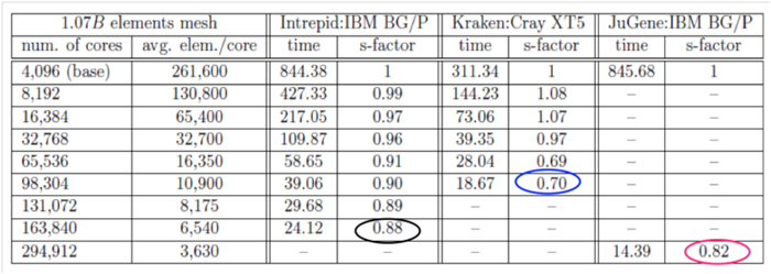 A prerequisite to supporting unstructured mesh operations and adaptive simulations on petascale computers is ensuring that the unstructured mesh solvers scale on these machines. ITAPS team members are involved with the development of such solvers based on implicit methods and unstructured, adapted meshes. This challenging but important class of methods allows for efficient solution of many interesting real-world problems that are otherwise prohibitively expensive to consider with methods using structured grids (mesh grows too large) and/or explicit methods (time step becomes too small). Strong scaling of a method based on unstructured, implicit and adaptive techniques not only enables the solution of extremely large problems but also allows for significant compression in the solution-time for a fixed size problem. Achieving strong scaling on leadership class computing facilities requires advanced interoperable software tools designed specifically to meet the needs of different domain-specific simulations. Table 2 illustrates the parallel efficiency of PHASTA, a parallel, unstructured and implicit flow solver developed at RPI on up to O(100,000) cores of IBM BG and Cray XT systems. PHASTA uses ITAPS technologies including FMDB and the MeshAdapt service for refinement on up to 16K processors and iMeshP and iZoltan to partition the resulting meshes into 128K parts for distribution to the full machine for the analysis step. Near-perfect (linear) strong scaling of the analysis step over multiple doublings of cores can be clearly seen on various systems with a slight decrease in parallel efficiency on the largest core counts due to the fact that computational load per core becomes insignificant (for a fixed-size problem).