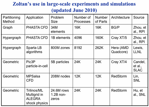 The Zoltan toolkit provides dynamic load balancing, partitioning, data migration, graph coloring, and graph ordering to dynamic, unstructured, and/or adaptive applications. Zoltan is currently used in a wide variety of applications, including mesh-based PDE simulations, crash and contact detection, particle simulations, linear solvers and preconditioners, and electrical network simulations. Zoltan has been used in production environments on platforms ranging from small clusters to leadership-class computing platforms. Some examples of Zoltan's use in large-scale simulations are shown in the table.